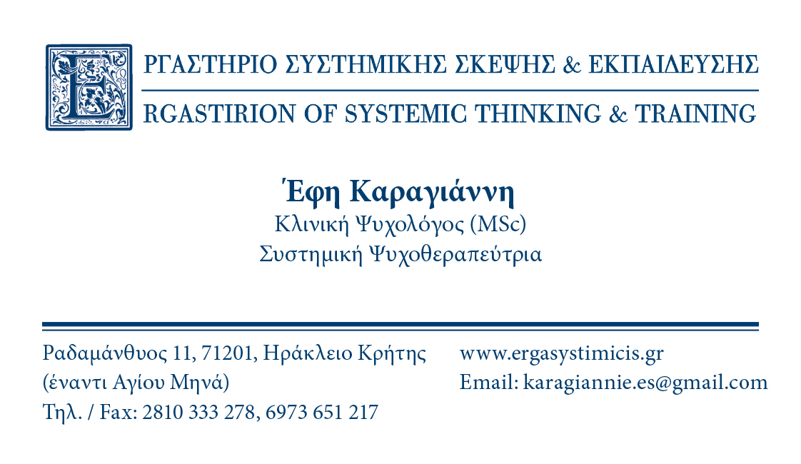 Στο Εργαστήριο Συστημικής Σκέψης & Εκπαίδευσης παρέχονται ψυχοθεραπευτικές υπηρεσίες σε άτομα, ζευγάρια και οικογένειες από εξειδικευμένους επαγγελματίες ψυχικής υγείας με αναγνωρισμένη εκπαίδευση στη Συστημική Ψυχοθεραπεία.